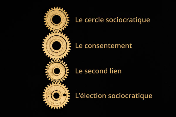 Pour mettre en place l’équivalence entre les acteurs et le développement de l’intelligence collective, la sociocratie s’appuie sur 4 règles de base : structure de décision en cercles, décision par consentement, doubles liens, élection par consentement.